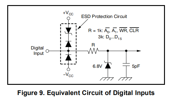 DAC712数字输入与TTL兼容(1.4V开关电平),具有低泄漏、高阻抗输入。因此,输入适合于由任何类型的5V逻辑驱动,例如5vcmos逻辑。数字输入的等效电路如图9所示。