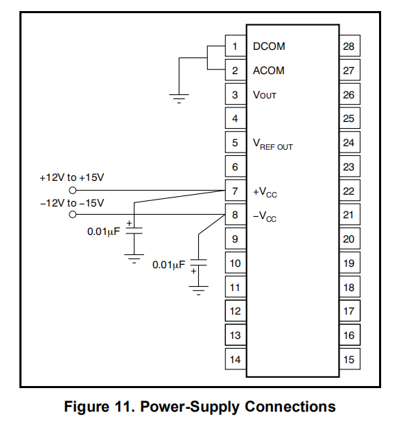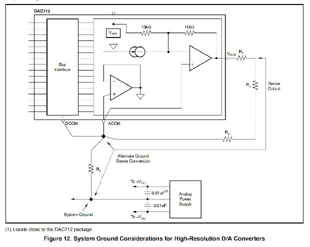 如果使用多个DAC712,或者如果DAC712与其他组件共享电源,则将ACOM和DCOM线路连接在一起一次(而不是在每个芯片上)可能会获得更好的结果。