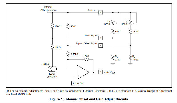 增益和偏移调整引脚提供了使用外部电位计的微调。15圈电位计提供足够的分辨率。这些微调的调整范围至少为满刻度范围的±0.3%;见图13。