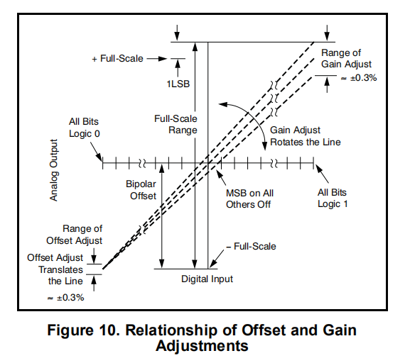 图10说明了双极性连接D/a的偏移和增益调整之间的关系转换器偏移量应首先进行调整,以避免调整的相互影响。表1显示了校准值和代码。这些调整的最小范围为±0.3%。