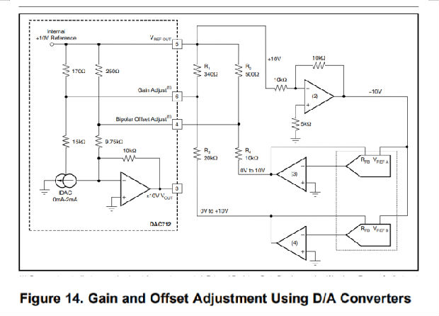 DAC712的增益调整和偏移调整电路已经布置好,以便这些点可以容易地由外部D/A转换器驱动;见图14。12位D/A转换器提供偏移调整分辨率和增益调整分辨率,每LSB步进30μV到50μV。