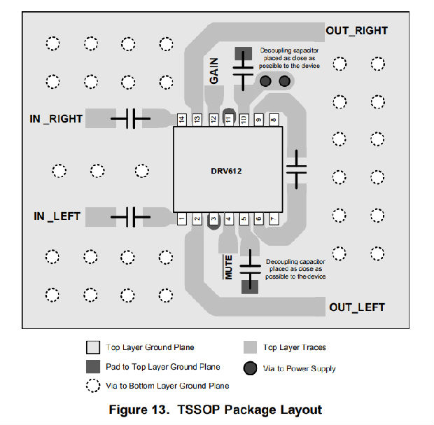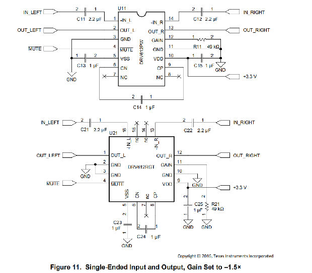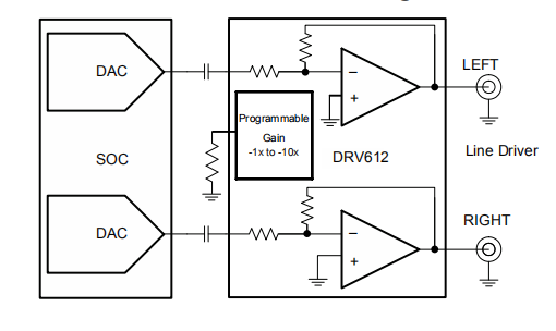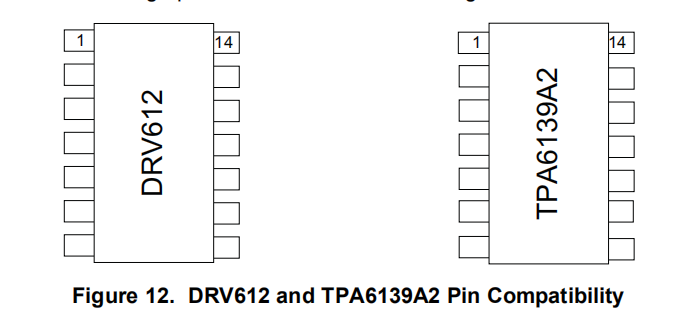 DRV612立体声线路驱动器与耳机放大器TPA6139A2引脚兼容。因此,单个PCB布局可以与填充选项一起用于不同的板配置。