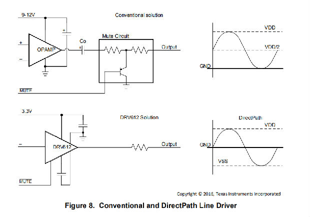 单电源线驱动放大器通常需要直流阻断电容器。图8中的上图说明了传统的线路驱动器放大器与负载和输出信号的连接。