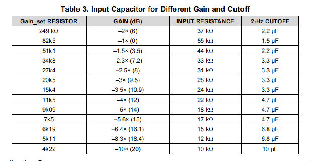 对于2赫兹的固定截止频率,输入电容的大小如表3所示,电容器四舍五入到最接近的E6值。对于20Hz截止,只需将电容值除以10;例如,对于1×增益,需要150 nF。