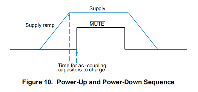在电源上升和下降过程中,通过保持静音引脚处于低位,确保无弹出电源。引脚应保持在较低水平,直到输入交流耦合电容器充满电,然后再确定静音引脚高,这样就可以对交流耦合进行适当的预充电,从而实现无弹出式通电。图10说明了优先顺序。