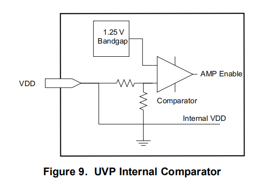 DRV612包含一个内部精确的带隙基准电压和一个用于监控电源电压VDD的比较器。内部VDD监视器设置为2.8 V,滞后200 mV。