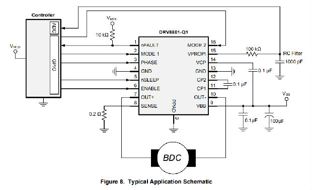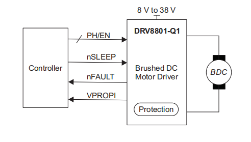 DRV8801-Q1设备用于中压有刷直流电机控制应用。
