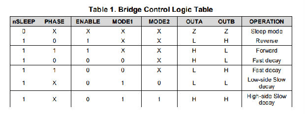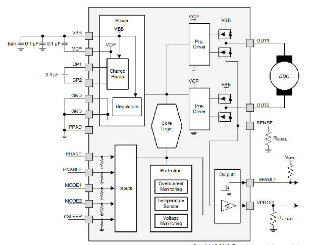 输出级使用配置为½-H桥的N沟道功率mosfet。DRV8801-Q1的峰值输出电流高达±2.8A,工作电压高达38V。内部电荷泵产生所需的栅极驱动电压。