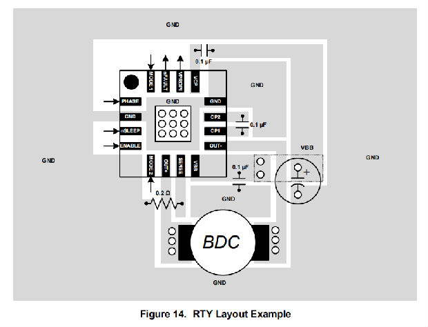 •印刷电路板(PCB)应使用重型接地板。为了获得最佳的电气和热性能,DRV8801-Q1必须直接焊接到电路板上。在DRV8801Q1的下面是一个热垫,它提供了增强散热的路径。热焊盘应直接焊接到PCB的外露表面上。热通孔用于将热量传递到PCB的其他层。
