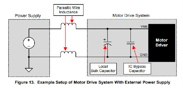 电源和电机驱动系统之间的电感会限制电源电流的变化率。如果局部大容量电容太小,系统将对过大的电流需求作出响应,或者随着电压的变化而从电机中卸载。当使用足够的大容量电容时,电机电压保持稳定,并能快速提供大电流。