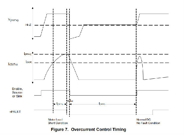 监控流经高压侧和低压侧驱动器的电流,以确保电机导线没有对电源或接地短路。如果检测到短路,H桥中的所有FET将被禁用,nFAULT被驱动为低电平,并且t(OCP)故障计时器启动。在这段时间t(OCP)之后,允许设备遵循输入命令,并尝试另一个开启(在此尝试期间nFAULT释放)。如果仍有故障,则循环重复。如果t(OCP)失效后短路状态不存在,则恢复正常运行并解除nFAULT。