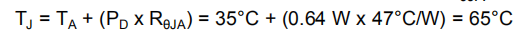 在本例中,环境温度为35℃,结温达到65℃。在65℃时,RDS(ON)之和约为1Ω。如果电机电流为0.8 A,以热量形式耗散的功率将为0.8 A2x 1Ω=0.64 W。