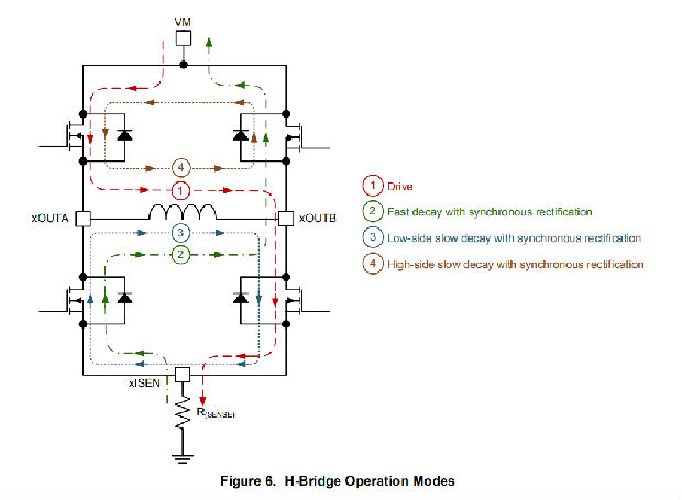 在慢衰减模式下,低压侧和高压侧驱动器都会打开,允许电流通过H桥和负载的低压侧和高压侧主体二极管循环(图6中的3和4)。有关计算高侧和低侧慢衰变功率的公式,请参见功耗部分。