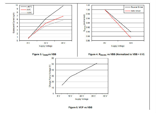 电荷泵用于产生高于VBB的电源,以驱动源端DMOS门。CP1和CP2之间应连接一个0.1-μF陶瓷单片电容器,以便于泵送。在VCP和VBB之间连接一个0.1μF的陶瓷单片电容器,作为储能器来运行高侧DMOS器件。