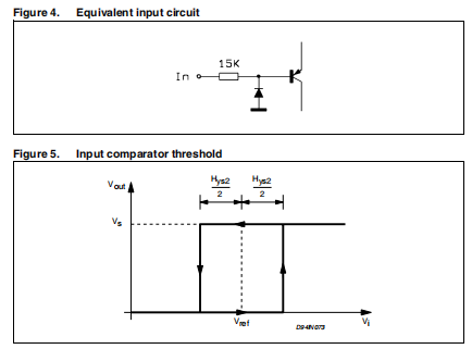 每个通道的输入级都是一个内置迟滞的高性能比较器(200 mV)高抗扰度。每个比较器有一个输入连接到所有其他连接到一个共同的引脚参考(引脚11)。如果这个引脚是浮动的内部精确应用带隙基准电压(1.25 V),否则这些输入可以是外部的通过连接外部电压源(从0到5 V)和电流该引脚内部限制为±20 mA。每个比较器的另一个输入引脚可以摆动从-7到35伏。由于这个原因,它已经实现了第10页图4所示的结构和该装置也可作为线路接收器使用。当输入电压为负时,电流由15 kΩ电阻器组件内部限制如第10页图4所示。高和低输入阈值可以通过和将迟滞减去引脚Ref电压的一半(参见第10页图5)。