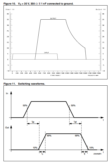 当电感器可以放电时进行开关;而如果输出为“延迟”开关过渡倾向于启动充电阶段(见图9)。带着几乎没有负载的寄生元件,波形类似于纯电阻情况下的波形。对于真实的、更复杂的负载,感应反冲的影响与电阻负载,会更明显。当电容器和电阻器并联作为负载时,可以看到另一种波形(如图10所示)。只要输出级保持在瞬态高阻抗状态,输出电压将遵循经典的RC松弛指数定律。一旦另一个晶体管接通并充电,波形就很快强行达到其稳态值。从上面可以看出开关时间,固有的非常快,是如何如果输出负载不准确,则很难在波形中识别输出级考虑在内。图11显示了输入和输出的典型开关波形。