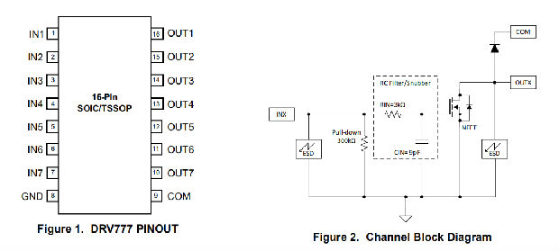 该器件通过并行组合多个相邻通道,提供了增加电流吸收能力的灵活性。在典型情况下,当所有7个通道并联时,DRV777可支持高达1.0A的负载电流。DRV777有16针SOIC和16针TSSOP封装。