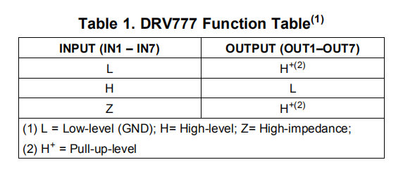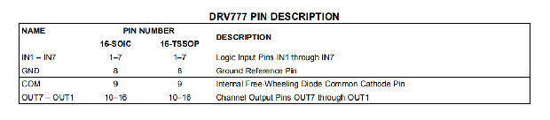 如功能图所示,DRV777的每个输出都有一个内部自由轮二极管,连接在COM引脚的公共阴极配置中。