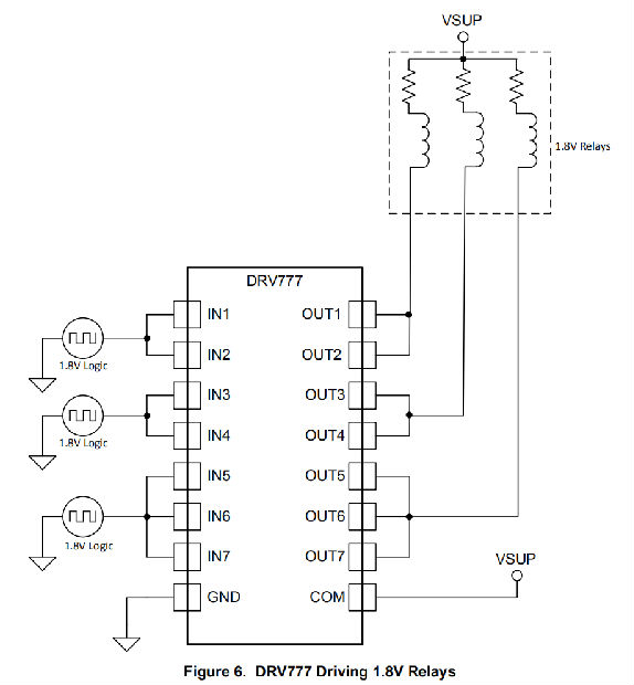 为了驱动低电压继电器,如1.8V,如图6所示,并联连接两个或多个相邻通道。并联连接多个通道可降低通道输出电阻,从而使固定电流的体积最小化。DRV777可用于驱动3V、5V和12V继电器,具有类似的实现。