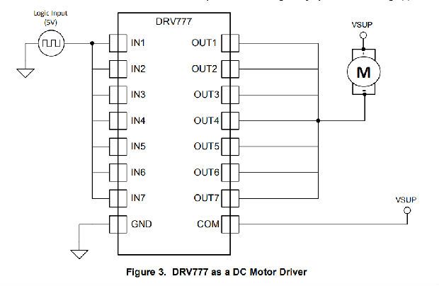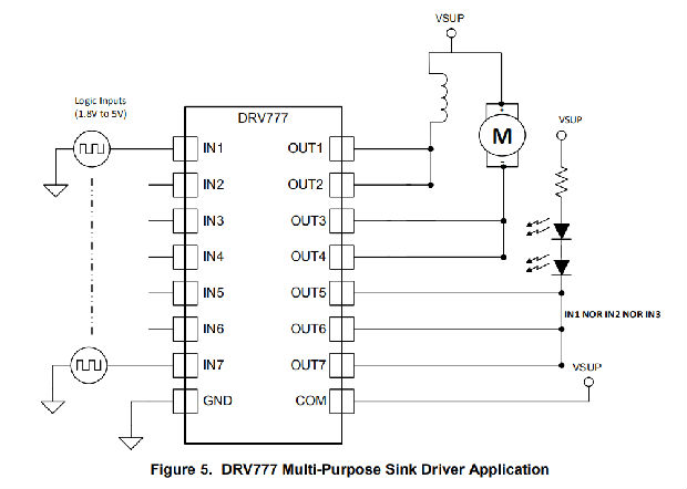 按照图5配置时,DRV777可以用作多用途驱动程序。输出通道可以连接在一起以吸收更多的电流。DRV777可以轻松驱动电机、继电器和LED,功耗很小。COM引脚必须连接到由自由轮二极管保护的感应负载的电源上。
