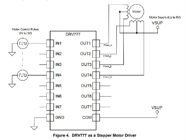 图4显示了驱动单倍步进电机的DRV777的实现。未连接的输入通道可用于其他功能。当一个输入引脚保持开路时,内部300kΩ下拉电阻器将相应的输入引脚拉至GND电位。为了提高抗扰度,在未连接的输入和GND引脚之间使用外部短路。