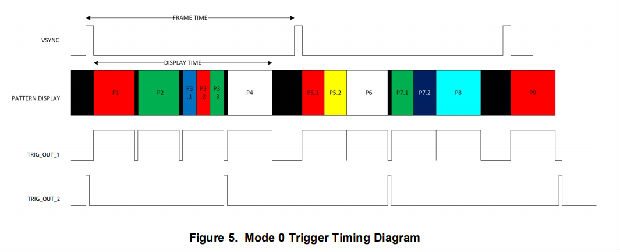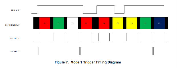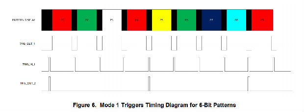 触发模式1的示例如图6所示。显示四个图案序列。TRIG_OUT_1框显每个模式,而TRIG_OUT_2表示每个四个模式序列的开始。触发脉冲推进模式。