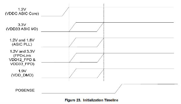 在DLPC350最小电源电压规格下,很难设置一个电源监控器来精确跳闸。因此,建议生成POSENSE的外部电源监控器将其阈值设定为最小电源电压的90%,并确保POSENSE在足够长的时间内保持低电压,以允许所有电源电压达到最低控制器要求并稳定。注意,用于检测功率损失的跳闸电压对POSENSE来说并不重要,因此可能低至额定电源电压的50%。此外,对于POSENSE来说,响应低电压条件的反应时间并不重要。INIT_DONE在这些方面有更重要的要求。