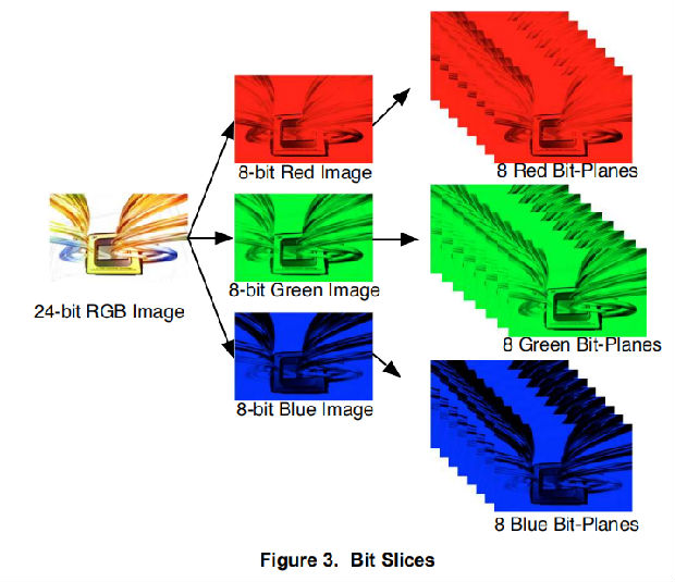 DLPC350以高达120赫兹的帧速率接收24、27或30位RGB数据作为输入。此帧速率由三种颜色(红色、绿色和蓝色)组成,每种颜色在120Hz帧速率中平均分配。因此,每种颜色都分配了2.78ms的时隙。因为每种颜色都有8位、9位或10位深度,所以每个颜色时隙都进一步划分为位平面。位平面是从全彩色2D图像的所有像素中提取的一个位的二维排列,以实现动态深度。见图3。