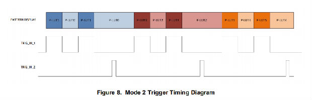 模式1的另一个示例如图7所示,其中显示了三个模式序列。TRIG_OUT_1框显每个显示的图案,TRIG_OUT_2表示每个三个图案序列的开始。_2中的TRIG_用作启动/停止信号。高时,模式序列开始或继续。请注意,在显示P4模式的中间,_2中的TRIG_低,因此序列停止显示P4。当触发_2中的TRIG_时,模式序列在停止处继续,重新显示P4。