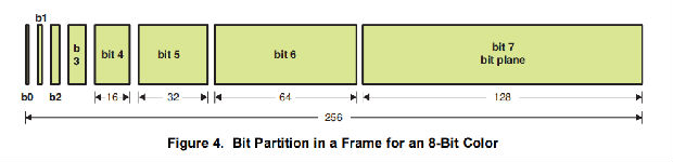 时隙中每个位平面的长度由其二进制表示的相应幂加权。这提供了图像的二进制脉冲宽度调制。例如,24位RGB输入有三种颜色,每种颜色的深度为8位。每个彩色时隙分为8个位平面,该时隙中所有位平面的权重之和等于256。如图4所示,请参阅图4,以了解帧中的位划分。