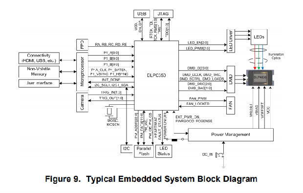 使用DLPC350的典型嵌入式系统应用程序如图9所示。在此配置中,DLPC350控制器支持来自外部源或处理器的24位并行RGB输入(LCD接口的典型输入)。该系统同时支持静态和动态视频源。然而,控制器只支持周期性同步脉冲源。这是运动视频源的理想选择,但也可以用于静态图像,方法是保持周期性同步,只在需要时发送新的数据帧。静止图像必须完全包含在一个视频帧中,并且满足帧定时约束。DLPC350以源帧速率刷新显示的图像,并在没有接收到新帧的间隔内重复上一个活动帧。