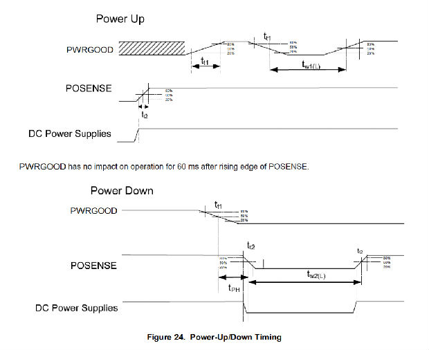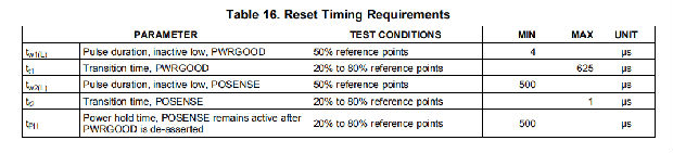 •所有控制器电源应在POSENSE被断言之前接通,以确保正确执行加电初始化。1.8V PLL电源、1.9V I/O电源和3.3V I/O电源应保持不变,只要使用1.2V核心电源和POSENSE。