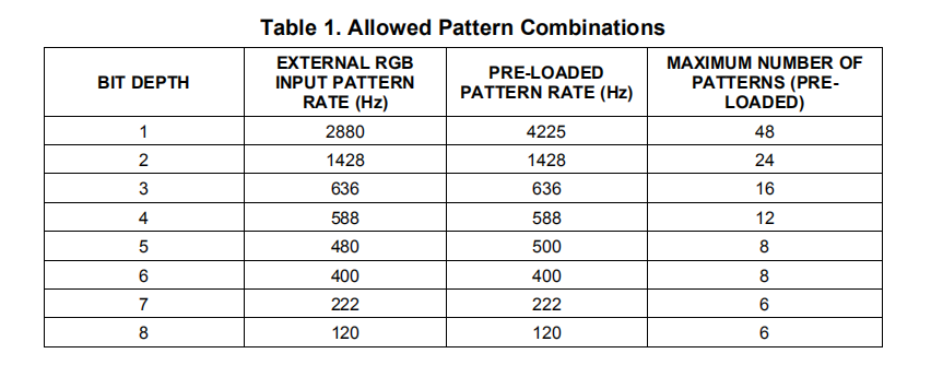 在结构光模式下,48位平面可以从闪存中预装,然后用不同位深度的图案组合排序。为了使相机与显示的图案同步,DLPC350支持三种触发模式:模式0、模式1和模式2。