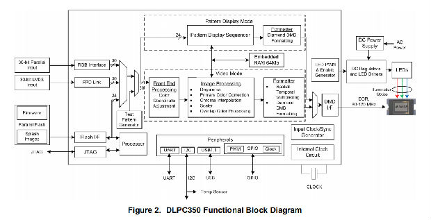 DLPC350是0.45 WXGA芯片组中的两个设备之一(见图1)。另一个设备是DLP4500 DMD。