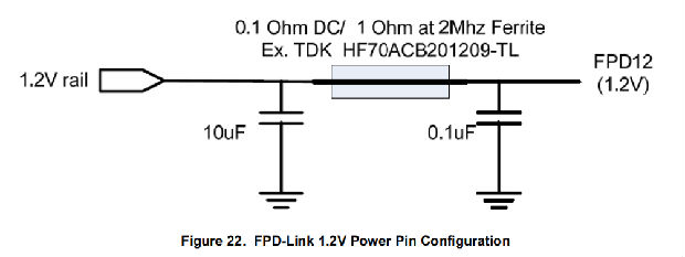 控制器支持FPD链路兼容的LVDS输入,用于输入视频/图形数据以进行显示的附加方法。此接口有一些与其他控制器1.2V或3.3V电源轨分开的特殊控制器电源考虑事项。FPD Link 1.2V电源引脚配置示例如下所示。