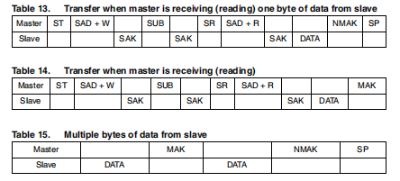 数据以字节格式(Data)传输。每次数据传输包含8位。号码每次传输传输的字节数是无限的。数据以最高有效位传输(MSb)第一个。如果接收器在执行之前不能接收另一个完整的数据字节其他一些功能,它可以保持时钟线,SCL低,迫使发射机进入等待国家。只有当接收器准备好接收另一个字节并释放时,数据传输才会继续数据线。如果从机接收器没有确认从机地址(即它不能接收,因为它正在执行一些实时功能)数据线必须保持在高位。然后主机可以中止传输。SDA线上的一个从低到高的转变SCL线高时被定义为停止条件。每次数据传输必须由于生成停止(SP)条件而终止。为了读取多个字节,有必要断言子地址字段的最高有效位。换句话说,SUB(7)必须等于1,而SUB(6-0)表示要读取的第一个寄存器的地址。在所提供的通信格式中,MAK是主确认,NMAK是No主确认。
