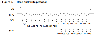 CS是串行端口启用,由SPI主机控制。一开始就很低传输并在最后返回高位。SPC是串行端口时钟由SPI主机控制。当CS高(无传输)时,停止高电平。SDI和SDO分别是串口数据的输入和输出。这些线是在SPC的下降沿,应在SPC的上升沿捕获。读寄存器和写寄存器命令在16个时钟脉冲或在多字节读/写的情况下为8的倍数。位持续时间是两次下降之间的时间SPC的边缘。第一位(位0)从下降沿之后SPC的第一个下降沿开始当最后一位(位15,位23,…)在SPC的最后下降沿开始时CS的上升沿。位0:RW位。0时,数据DI(7:0)写入设备。当为1时,数据为(7:0)从设备读取。在后一种情况下,芯片将在第8位开始时驱动SDO。