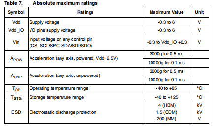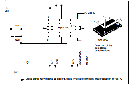 设备核心通过Vdd线供电,而I/O焊盘通过Vdd连接线。电源去耦电容器(100 nF陶瓷,10μF Al)应尽可能靠近装置的引脚6(一般设计惯例)。所有电压和接地电源必须同时存在,以便IC的行为(参考图5)。可以移除Vdd并保持Vdd_IO在不阻塞通信总线的情况下,测量链断电。装置的功能和测量的加速度数据是可选的,并且可通过I2C/SPI访问接口。什么时候使用I2C,CS必须绑得很高。两个中断引脚(INT 1和INT 2)的功能、阈值和定时可以是完全由用户通过I2C/SPI接口编程。