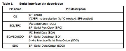 嵌入在LIS302DL中的寄存器可以通过I2C和SPI串行接口。后者可以被SW配置为在3线或4线中操作接口模式。串行接口映射到相同的焊盘上。选择/利用I2C接口,CS线路必须绑高(即连接到Vdd U IO)。