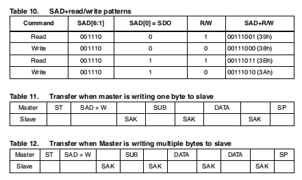 总线上的事务通过启动(ST)信号启动。启动条件是定义为当SCL线保持在高电平时数据线上的高到低转换。之后这已经被主控传输,总线被认为是繁忙的。数据的下一个字节在启动条件后传输,在前7位中包含从机的地址,并且第八位告诉主机是从机接收数据还是向其发送数据。当一个地址被发送时,系统中的每个设备会比较前7位在一个起始条件及其地址之后。如果它们匹配,则设备认为自己已寻址。与LIS302DL关联的从属地址(SAD)为001110xb。可以使用SDO pad修改设备地址的低有效位。如果SDO pad连接到电压电源LSb为'1'(地址0011101b),否则如果SDO pad连接到地面,LSb值为“0”(地址0011100b)。这个解决方案允许连接和处理两个不同的加速度计连接到相同的I2C线路。必须有确认的数据传输。发射器必须释放SDA线路在确认脉冲期间。然后接收器必须将数据线拉低,以便在应答时钟脉冲的高周期内保持稳定的低电平。一个接收器必须在数据的每个字节已收到。嵌入在LIS302DL中的I2C的行为类似于从设备必须遵守协议。在启动条件(ST)之后,发送一个salve地址,一次从机确认(SAK)已返回,将传输一个8位子地址:7LSb表示实际寄存器地址,而MSB启用地址自动递增。如果子字段的MSb为1,则SUB(寄存器地址)将自动递增允许多个数据读/写。从机地址由一个读/写位完成。如果位是“1”(读取),则重复启动(SR)条件必须在两个子地址字节之后发出;如果位为“0”(写入)主机将在方向不变的情况下发送给从设备。表10解释SAD+读/写位模式组成,列出了所有可能的配置。