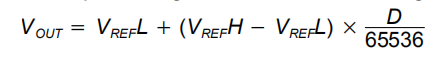 其中D=加载到DAC寄存器的二进制代码的十进制等效值;它的范围从0到65535。