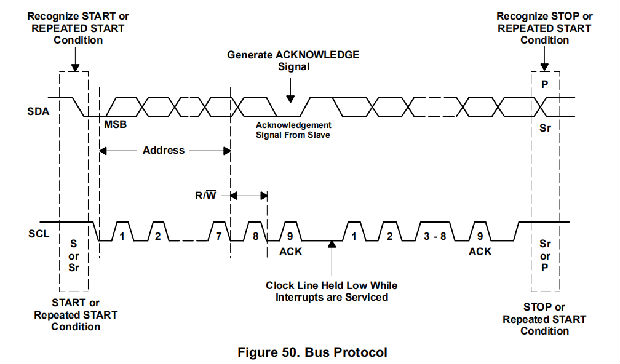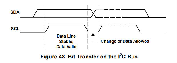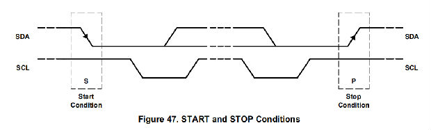 •主机通过生成启动条件启动数据传输。开始条件是当SCL为高时SDA线路上发生从高到低的转换,如图47所示。所有兼容I2C的设备都应该识别启动条件。