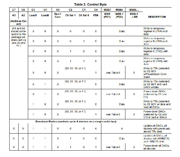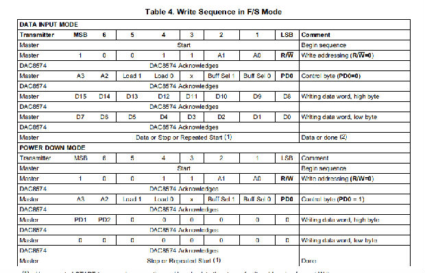 (2)、一旦DAC8574正确寻址并发送控制字节,高字节低字节序列可以重复,直到接收到停止或重复启动条件。