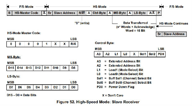 在HS模式下,主发射机写入从接收机(DAC8574)