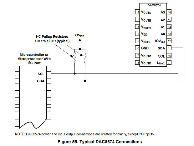 请注意,SCL线路上没有显示上拉电阻器。在这种简单的情况下,不需要电阻器。微控制器可以简单地保持线路输出,并根据需要将其设置为1或0。它能做到这一点是因为DAC8574从不降低时钟线。这种技术也可以用于多个设备,并且由于没有电阻拉升,因此具有较低的电流消耗的优点。
