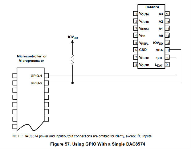 大多数微控制器都有可编程的输入/输出引脚,这些引脚可以在软件中设置为输入或输出。如果I2C控制器不可用,可以将DAC8574连接到GPIO引脚,并在软件中模拟I2C总线协议,或进行位碰撞。图57显示了单个DAC8574的一个示例。