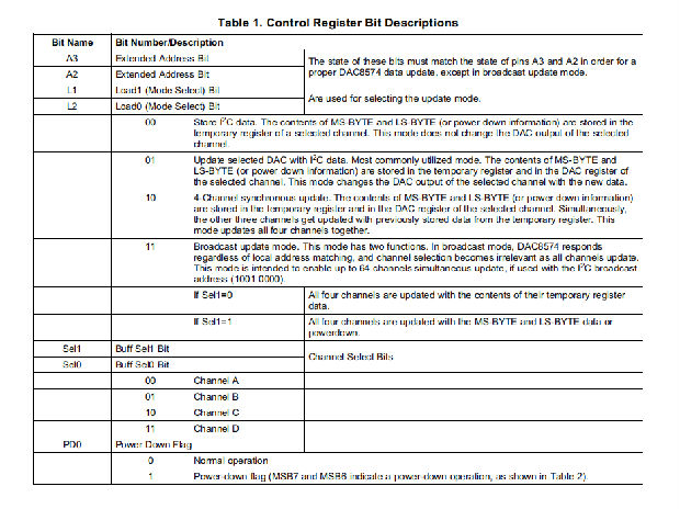 一旦选择了DAC8574设备,信道选择比特C2和C1可以选择特定信道。总体而言,I2C地址位A1、A0、控制位C7、C6、C2和C1构成了从64种可能性中选择一个信道所需的6位地址。