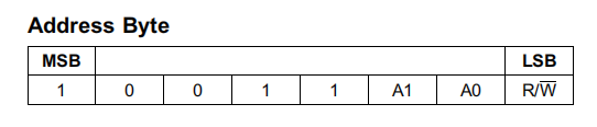 地址字节是在启动条件之后从主设备接收的第一个字节。地址的前五位(MSB)出厂时预设为10011。地址的下两位是设备选择位A1和A0。A1,A0地址输入可以连接到VDD或数字GND,或者可以由TTL/CMOS逻辑电平主动驱动。在DAC8574的通电序列期间,设备地址由这些引脚的状态设置。多达16个设备(DAC8574)仍然可以连接到同一I2C总线。