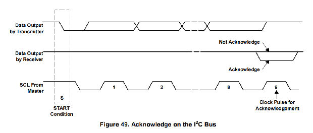 •主机随后生成SCL脉冲,并在SDA线路上传输7位地址和读/写方向位R/W。在所有传输过程中,主机确保数据有效。有效的数据条件要求SDA线路在时钟脉冲的整个高周期内保持稳定(见图48)。所有设备都能识别主机发送的地址,并将其与内部固定地址进行比较。只有具有匹配地址的从设备通过在第9个SCL周期的整个高周期中将SDA线拉低来生成应答(见图49)。当检测到该确认时,主机知道与从机的通信链路已经建立。