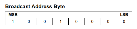I2C寻址和扩展寻址都支持广播操作。广播地址(10010000)使所有的DAC8574设备都能监听,而不管A0和A1管脚的状态如何。另外,广播命令(C5=C4=1)使所有设备都能监听,而不管A2和A3引脚的状态如何。同一个广播命令(C5=C4=1)也选择给定设备的所有频道,而不管频道选择位的状态如何。因此,同时更新多达64个信道的全局广播消息使用10010000作为I2C地址,并且在控制字中有(C5=C4=1)。